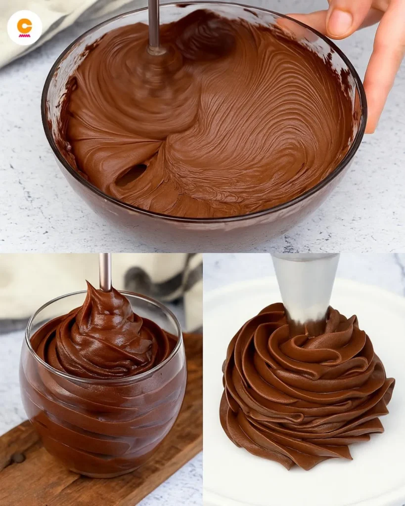 - Ponto de Batedeira: O segredo de bater o creme de chocolate frio com uma batedeira até ficar liso e cremoso, o que o transforma em uma textura de fudge aerado.
