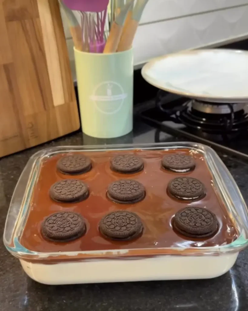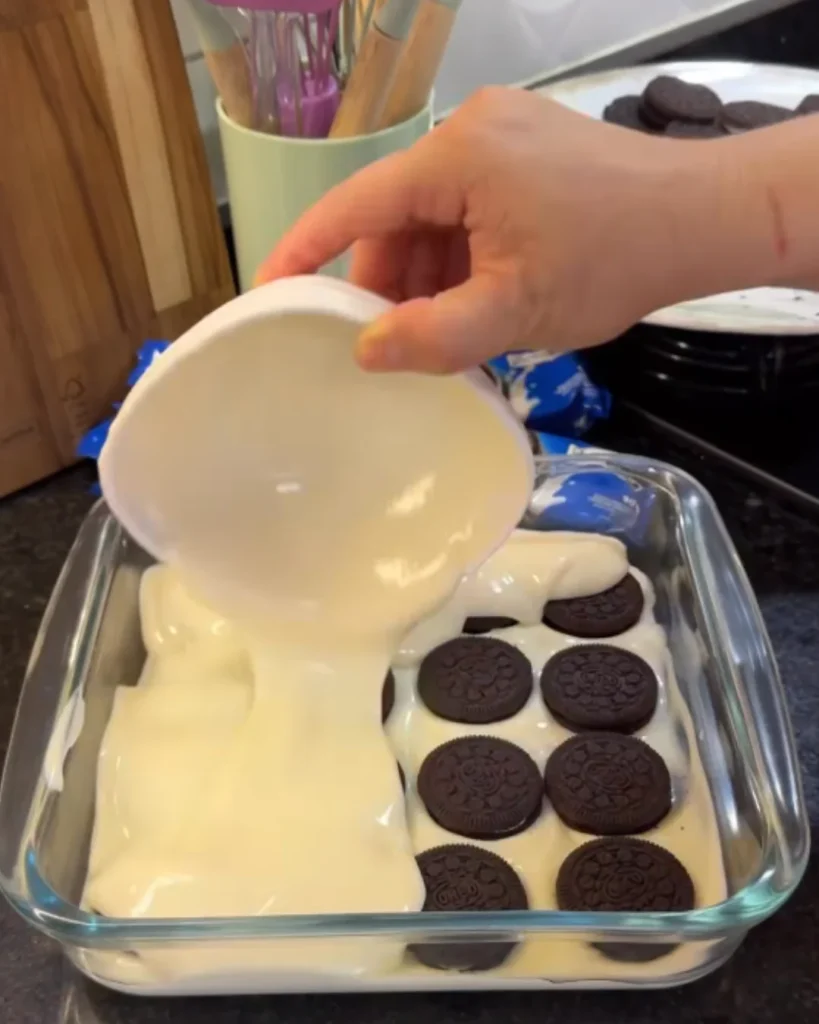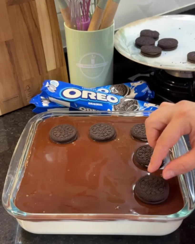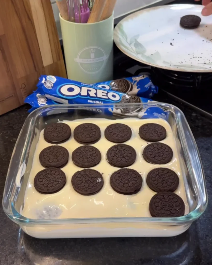 - Agora é só montar: em uma travessa ou em potinhos individuais, intercale camadas de creme branco e bolachas Oreo inteiras ou levemente quebradas.