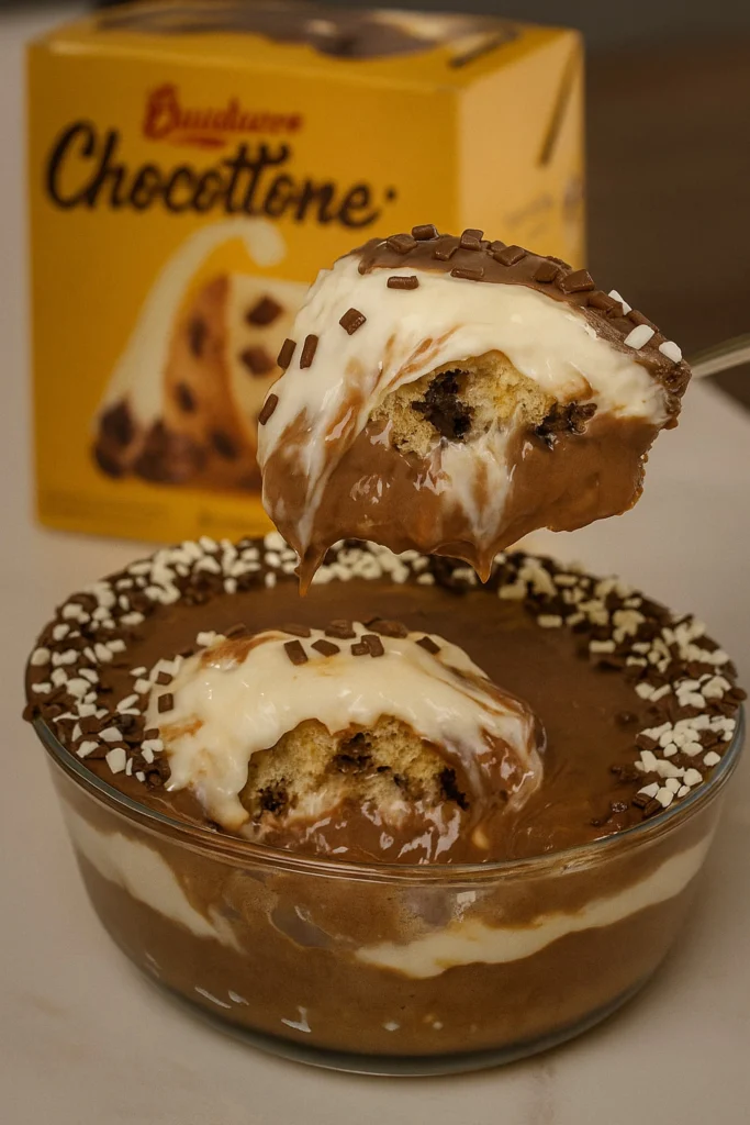 Com camadas de creme branco, creme de chocolate e pedaços generosos de panetone, essa delícia vai conquistar todos os convidados na primeira colherada. E o melhor: dá para personalizar com frutas ou até versões diferentes como Nutella ou doce de leite.