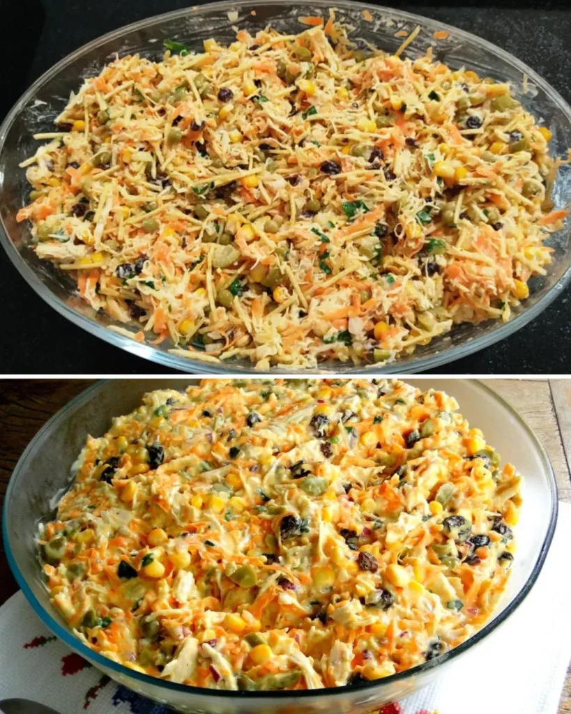 - Montagem da Base: Em uma tigela grande, misture o frango desfiado com a cenoura, a maçã, as uvas-passas, as azeitonas, o milho e o pimentão. Essa mistura precisa estar colorida e vibrante!